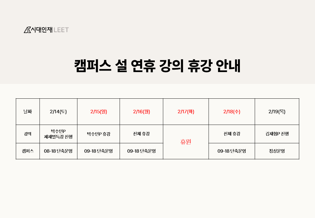 [공지] 시대인재LEET 설 연휴 학원 운영 안내 2026-01-28