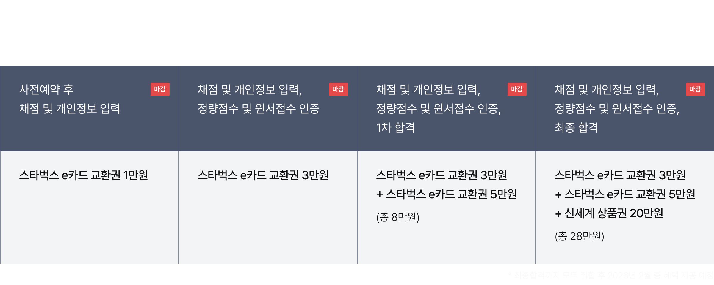 ㆍ①,②번을 순서대로 진행하고 ③,④에 모두 해당하는 경우 ⑤ 합격수기 작성 후 [스타벅스 e카드 교환권 3만원+5만원+신세계 상품권 20만원(총 28만원)]이 제공됩니다.
