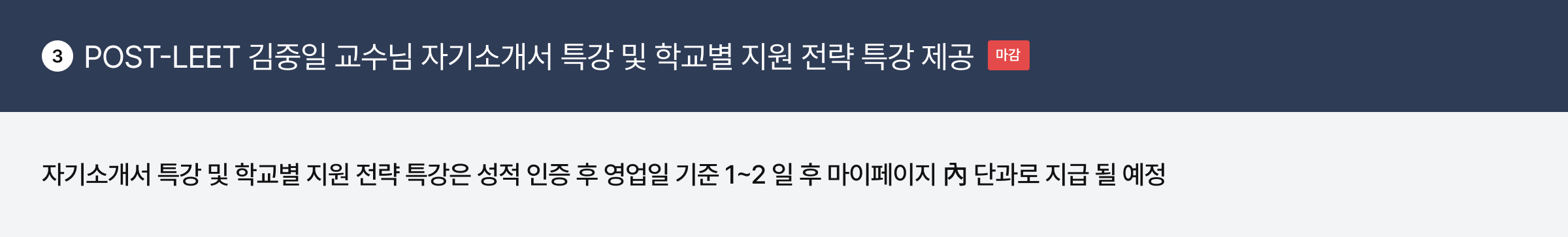LEET 성적 입력자 한정 제공되는 혜택으로 자기소개서 특강의 경우 LEET 성적 입력 후 영업일 기준 1~2일 후 지급되며 학교별 지원 전략 특강은 9/1(월) 이후 개별 문자로 안내될 예정입니다.